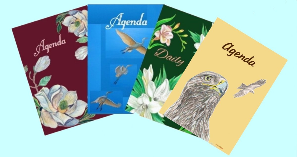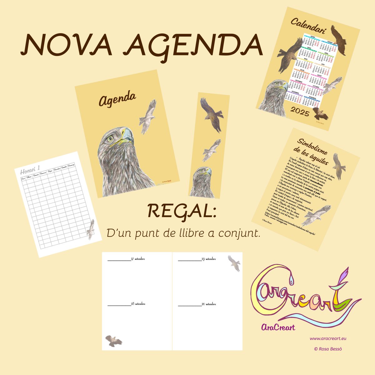 A AraCreart hem dissenyat una nova agenda. Ja tenim 4 models exclusius d'agenda per a col·leccionar. En la mateixa línia natural i simbòlica ara tenim una agenda amb dibuixos d'àguiles on s'inclou: calendaris, espai per horaris, espai per escriure 2 dies en cada full. És una agenda perpètua que serveix durant el curs escolar. Va de setembre a agost i també conté espai per anotacions.