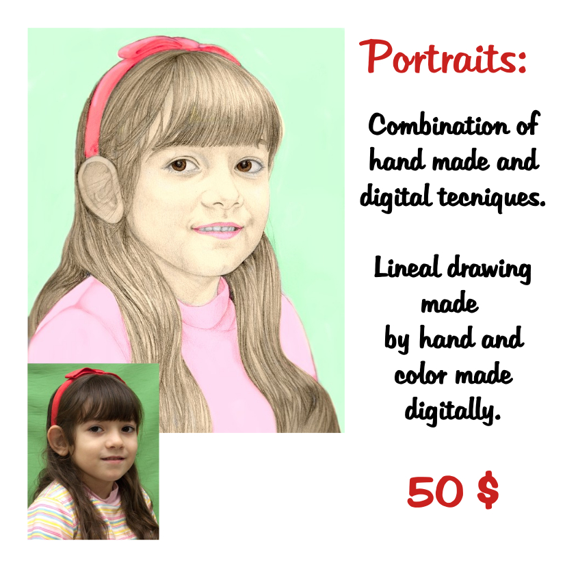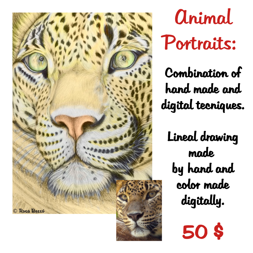 Comission to offer the possibility to adquire personalized realistic portraits of people and animals made with combination of hand made and digital techniques.
