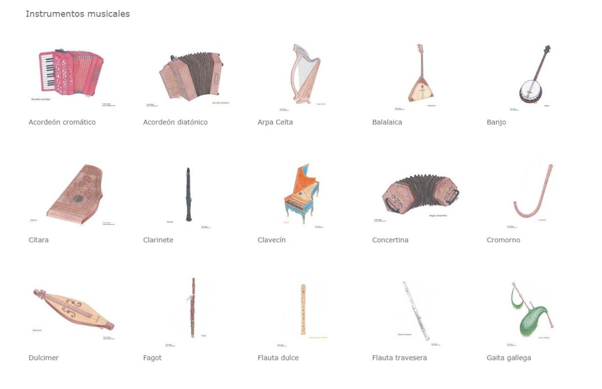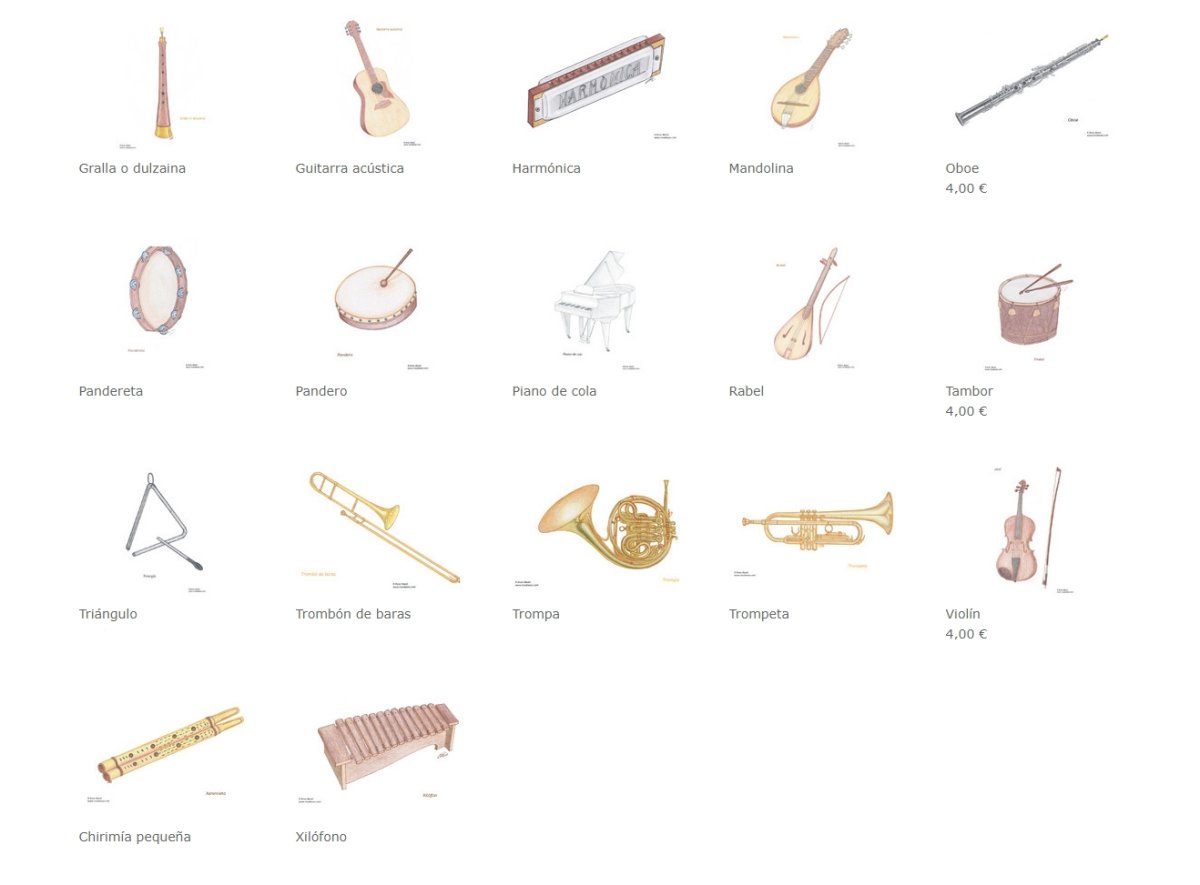 Postales musicales de 10 x 15 cm. De instrumentos, composiciones musicales imaginativas. Motivos con instrumentos.